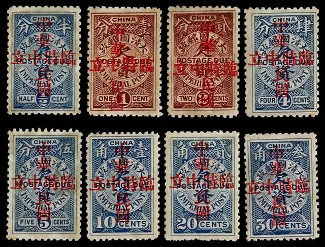 清欠资加盖“中华民国 临时中立”新票全套8枚,无胶或部分原胶,上中品。加盖有“临时中立”章,欠资邮票因受反对而停售,于是此组欠资票由上海海关造册处直行加盖“中华民国”四字成为“中华民国 临时中立”八字,但又受到反对而未正式发售。全套存世量极小,是欠资邮票中的大珍品。