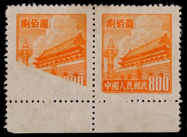 普3天安门800元新票横双连带底边纸,左下方图案大面积漏印露白大变体,由于印刷时纸张折叠,引至左边一枚邮票的下方大面积漏印图案,有一道明显的折痕。普3天安门图邮票整张200枚。经研究,本件折纸印刷若系左面底边一行的起首,则为仅此一件孤品,但因无左边纸,故无据证明其票位,由此进一步推测,与本件相邻的孪生姐妹,估计不会超过二件,它无疑是普票邮票中的大珍品,弥足珍贵,且色泽鲜艳,品像上佳。