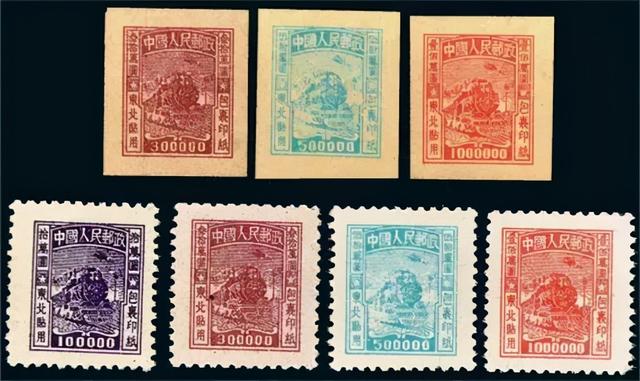 ▌1949年东北解放区火车图包裹印纸新票全套七枚