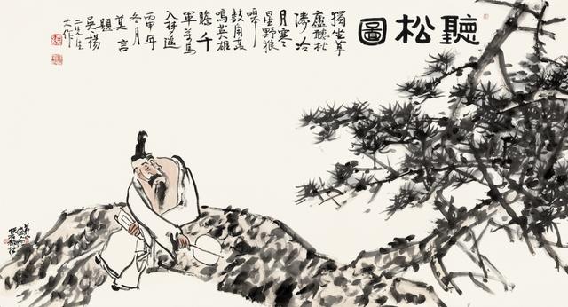 “大鱼不来小鱼来”引典姜太公钓鱼,表现悠然自得垂钓之余,而意在别家。水墨留白构图简易,图中老者身着蓑衣,头带蓑笠,闭目神态超然,持钓竿盘坐于石上。减笔的创作手法,笔墨简单,有文人笔墨的游戏性质,对人物及山石形态做高度概括,达到传神之妙,寥寥数笔所画人物便意态神足,具体生动。