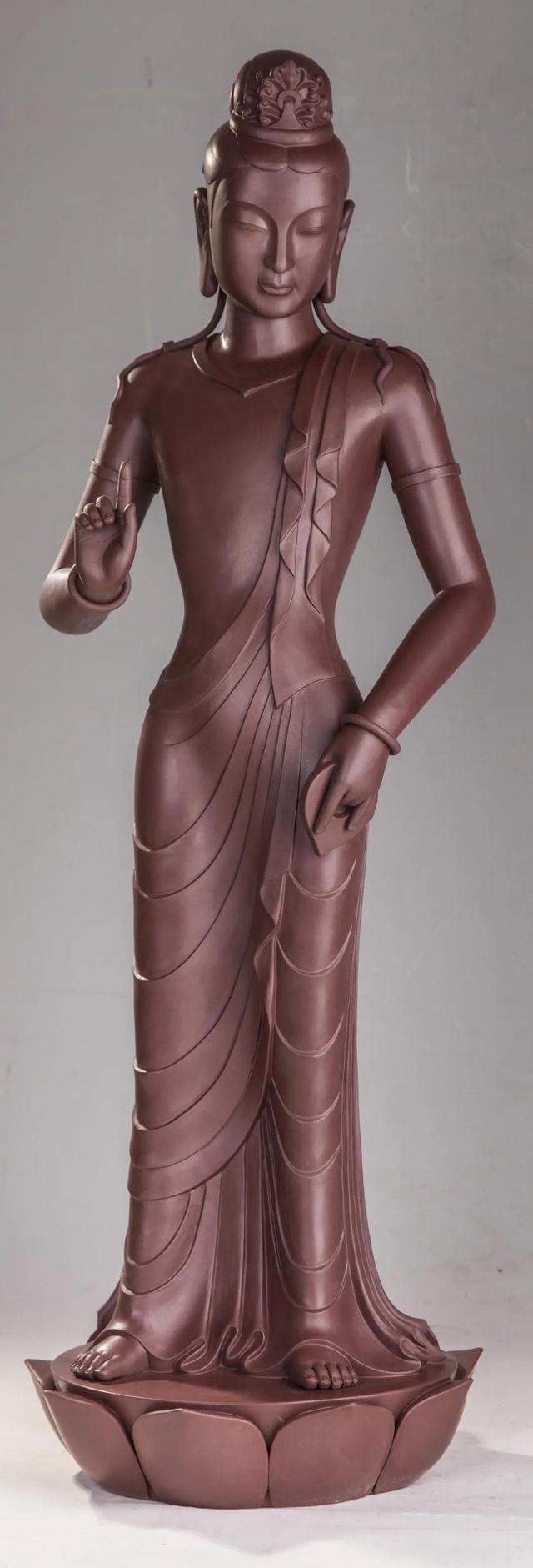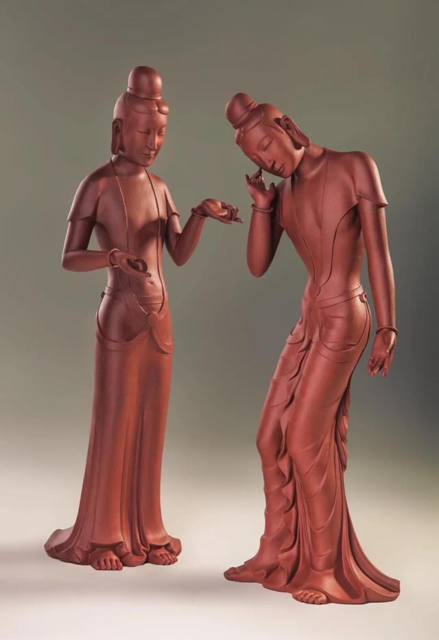 周刚的雕塑题材及手法多样,除佛教人物造像之外,有孤傲出世、超凡脱俗的古代高士;有活泼俏皮、富于生活情趣的青春女孩;还有一些介于佛教题材与现代观念之间、偏向写意表现的作品;加之我以前见到过的大型装饰壁画,整体展现出周刚在紫砂雕塑艺术的自由空间和惬意伸展。我一直觉得,使用紫砂材质是有局限性的,在它独特的视觉、质地和高辨识度等等优点之下,创作者比较容易被它原有的独特性套住,陷入喧宾夺主或是小格局造型的陷阱。