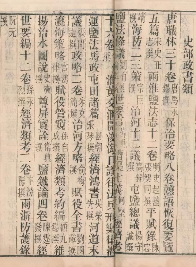 ▌《重修扬州府志》之“史 部政书类”有:《两淮盐法志十二卷》《海防二三策》 《治河十二议》《盐铁论四卷》等,凸显清代扬州之漕运、盐政、河务三大要政