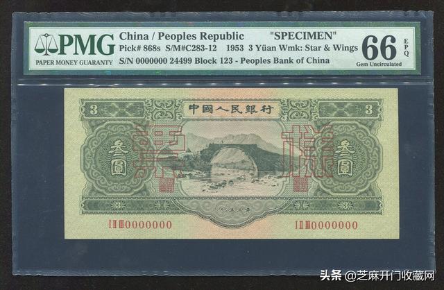 1953年第二版人民币叁圆票样一枚,PMG 66EPQ,估价: RMB 70000,成交价格: RMB 149500