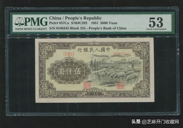 1949年第一版人民币伍仟圆牧羊一枚,PMG53 ,估价: RMB 50000,成交价格: RMB 138000
