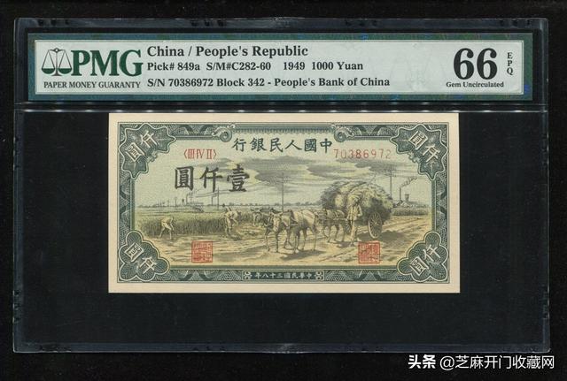 1949年第一版人民币壹仟圆秋收一枚,PMG 66EPQ,估价: RMB 80000,成交价格: RMB 218500