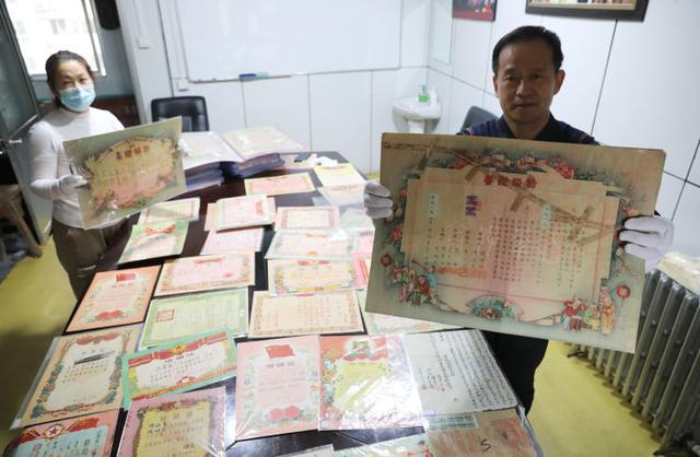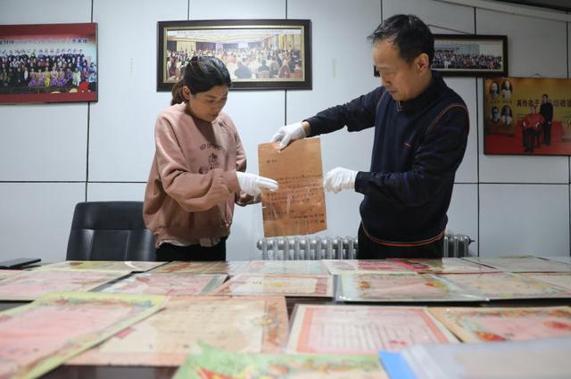 王耀堂和工作人员展示收藏的部分结婚证书。