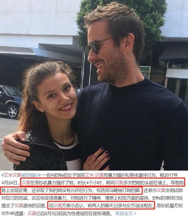 3月19日,据媒体报道,好莱坞著名影星艾米·汉莫被一位名叫Effie的女子指控对其进行了暴力侵犯和身体虐待的行为,并讲述了其中的详细过程,一时间引发众人热议。