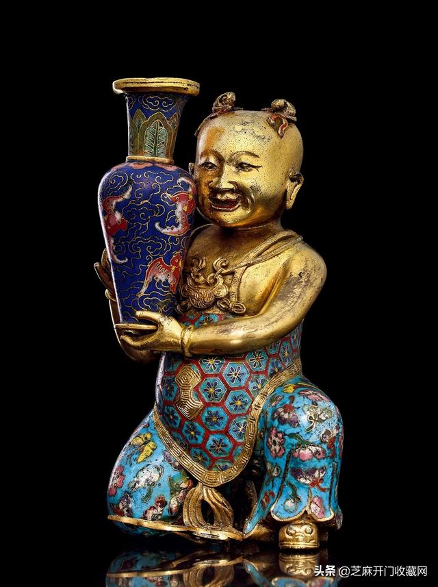 清乾隆御制铜胎掐丝珐琅「蝠报平安」花草纹童子香插,尺寸:高18.4厘米,成交价: RMB 1,150,000