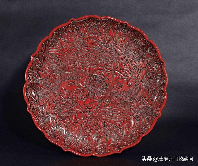 元末明初剔红牡丹绶带图葵瓣式盘,尺寸:高6.3厘米;直径46.5厘米,成交价: RMB 1,150,000
