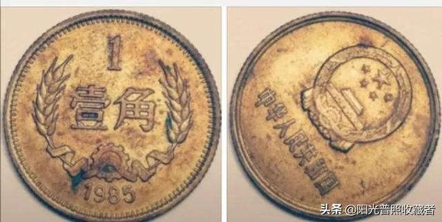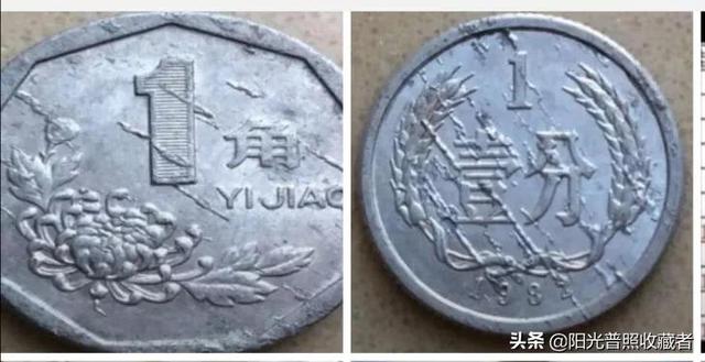 上图就是菊花一角和一分硬币的星雨币,这是条状的,还有显示连续点状的样式。比星雨币严重些就是鼓包币,也是铝质硬币所特有的。