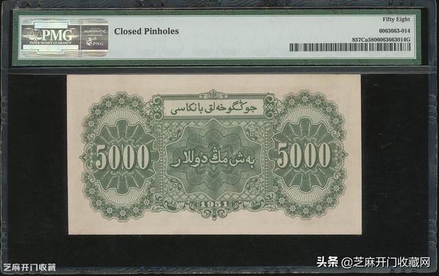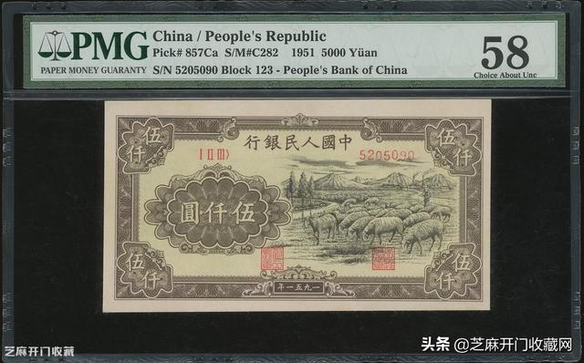 5:1951年中国人民银行第一版人民币5000元「牧羊」,编号 I II III 5205090,PMG 58,成交价格: HKD 216000