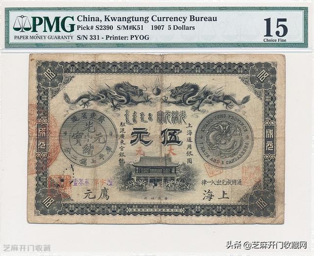 3:光绪三十三年广东官银钱局通用成元票鹰元伍圆 PMG Choice F 15 ,估价: HKD 200000,成交价格: HKD 380800