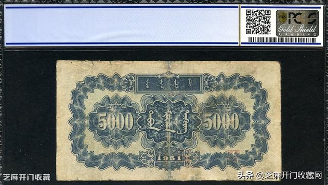 1:1951年第一套人民币伍仟圆蒙古包,为全套中之第二珍,票面有修补,PCGS 10 Details,成交价格: RMB 230000