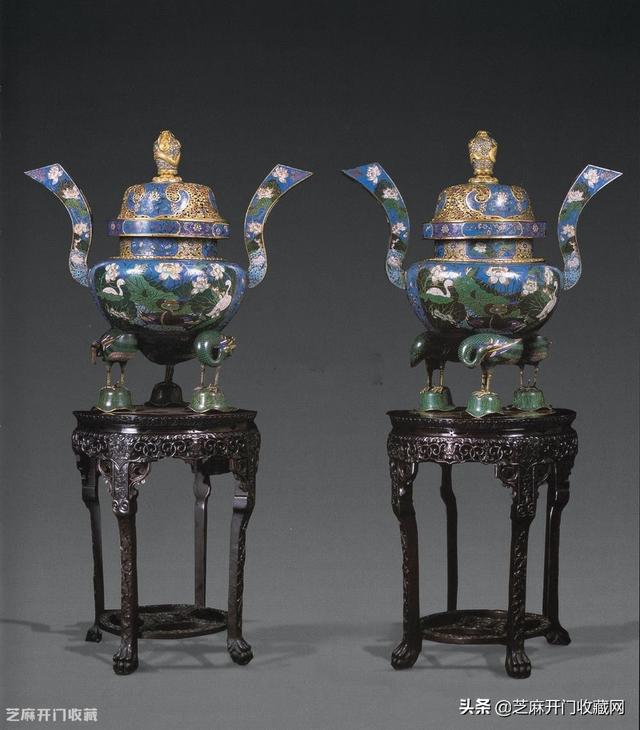 5:清乾隆铜胎掐丝珐琅《荷塘鸳鸯》图寿鹤三足盖炉(一对),尺寸:91.5厘米;78.7厘米,成交价 HKD 3,480,000