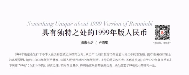 1999年版纸币发行于中华人民共和国成立50周年之际,从当年10月1日起作为第五套人民币中的首发版,因存在某些印制上的客观原因,随后由2005年版纸币替换。中国人民银行对1999年版纸币,执行的是只收不发,不停止流通。由于1999年版纸币(以下简称“99版”)发行时间短,回收迅速,实际存世量少,特别是它具有的独特之处,从而注定了99版纸币的非凡一生。