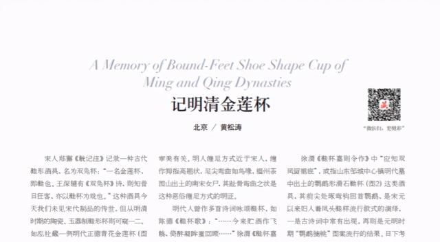 宋人郑獬《觥记注》记录一种古代鞋形酒具,名为双凫杯:“一名金莲杯, 即鞋也。王深辅有《双凫杯》诗,则知昔日狂客,亦以鞋杯为戏也。”这种酒具今 天我们未见宋代制品的传世,但从明清时期的陶瓷、玉器制鞋形杯则可窥一二。如泓社藏一例明代正德青花金莲杯,即属此种饮具。