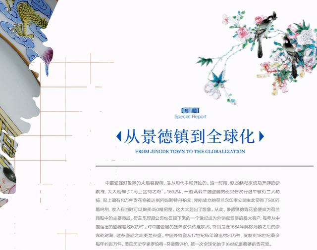 中国瓷器对世界的大规模影响,是从明代中期开始的。这一时期,欧洲航海家开辟了新航线,大大延伸了“海上丝绸之路”。景德镇的青花瓷也成为荷兰商船中的主要商品。每年从中国运出的瓷器超过60万件。特别是在1684年解除海禁之后的康雍乾时期,这条瓷器之路更是兴盛。中国外销瓷从17世纪每年输出约20万件,发展到18世纪最多每年约百万件。美国历史学家罗伯特·芬雷曾评价,第一次全球化始于16世纪景德镇的青花瓷。