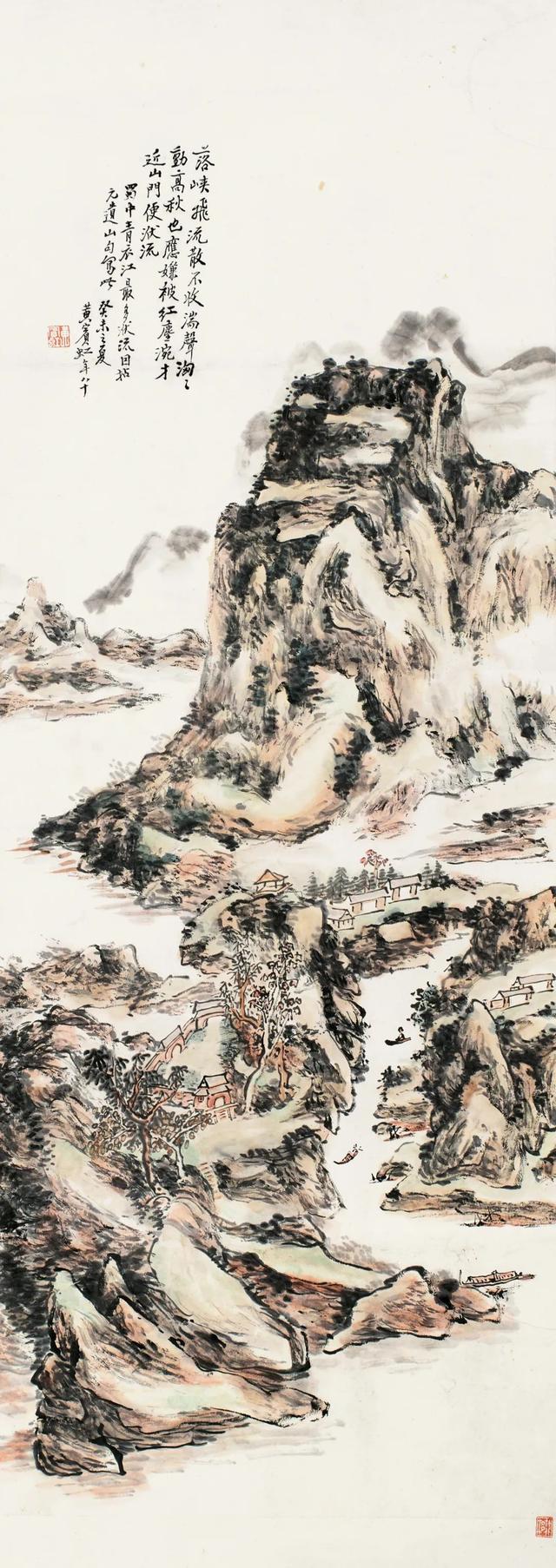 题识:落峡飞流散不收,湍声汹汹动高秋。也应嫌被红尘浣,才近山门便洑流。蜀中青衣江最多洑流,因拈元遗山句写此。癸未之夏,黄宾虹年八十。