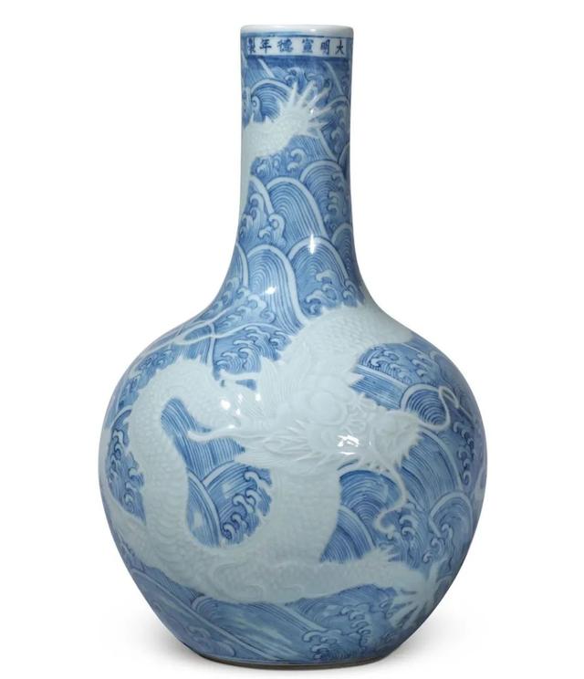 清雍正 青花模印海浪龙纹天球瓶