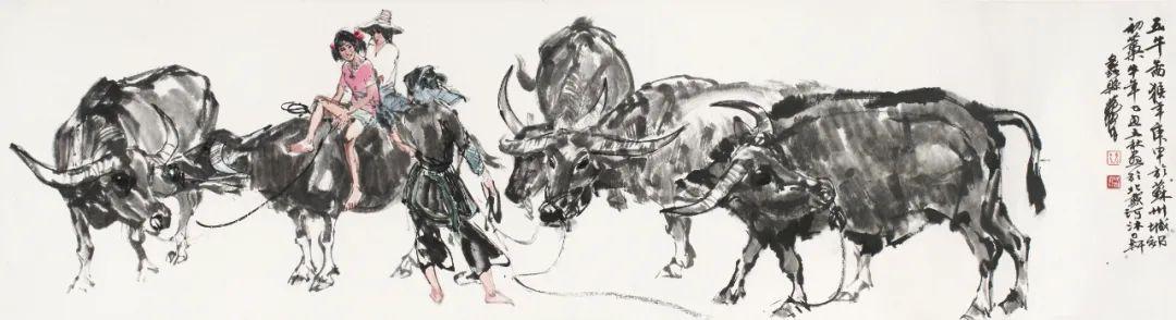 题识:五牛图。猴年庚申于苏州城郊初稿,牛年乙丑立秋画于北戴河沐日轩,蠡县黄胄。