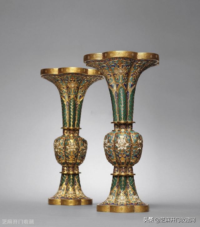 4:清乾隆铜鎏金填珐琅花觚(一对),尺寸:高31.5厘米,估价:HKD 200,000 ~ 300,000,成交价: HKD 575,000