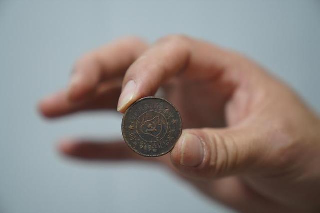 徐光明正在和同事讲述中华苏维埃共和国五分钱币的来历
