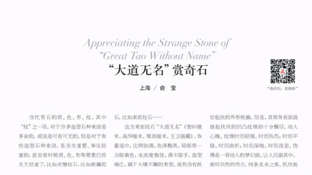 大道无名,源自东汉成书中《太上老君说常清静经》,老君曰:“大道无形,生育天地;大道无情,运行日月;大道无名,长养万物;吾不知其名,强名曰道。”关于赏石,有时候只要一两个元素非常突出,就足以使人令人过目不忘。