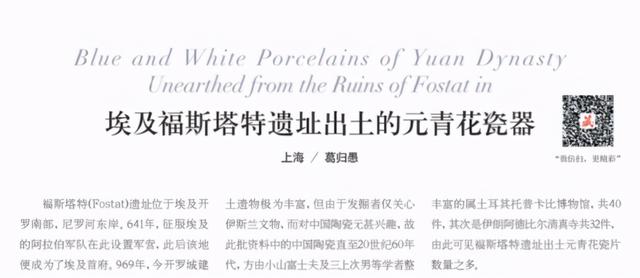福斯塔特遗址位于埃及开罗南部,尼罗河东岸,1998年至2001年间,弓场纪之先生对此间出土的中国瓷器进行了重新整理,总数逾1.2万片,其中元青花瓷器碎片达298片,由此可见福斯塔特遗址所出土的元青花瓷片数量之多。