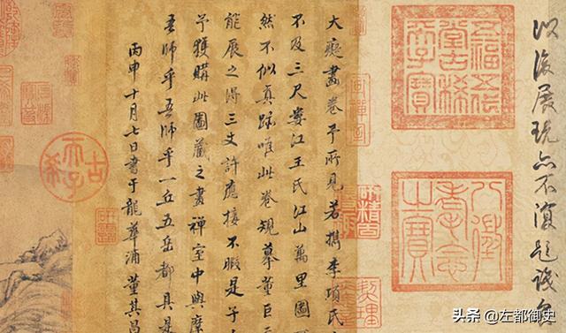 乾隆对《富春山居图》的喜爱到了痴迷的程度,他在上面盖了无数的印章。我们知道,乾隆还有个外号叫“盖章皇帝”,凡是他喜欢的书画作品,都要盖上几方印章,不过对于后世来说,这也是好事,因为有了乾隆印章的加持,作品也就越显得珍贵。