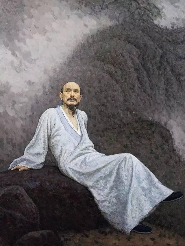 《髡残》是靳尚谊尝试水墨与油画结合的重要作品。明末清初四僧之一的髡残画风以浓密为特点,这刚好满足油画的水墨表达,高难度的全身像与真实山水环境融合,油画的真实再现与山水的写意表现相结合。