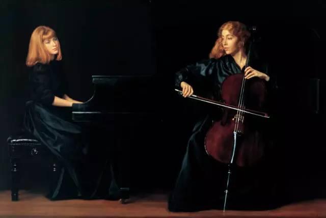以深色背景衬托二位音乐家演奏时的动态和神情,静中有动,相得益彰,古典音乐中那既深沉,又浪漫的唯美色彩弥漫其中。作品构思大气高雅,笔触柔和不失精准,几乎达到完美境界,令观者为之倾倒。