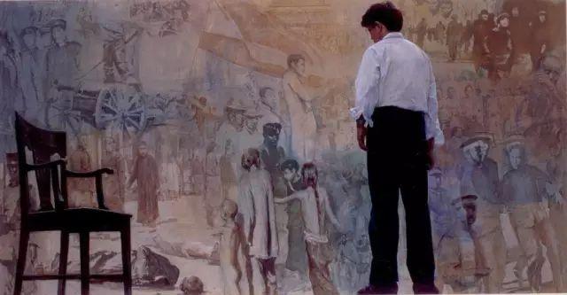 《踱步》是一件自画像性质的作品,画面的左侧是一把带有厚重历史感的老旧的黑色靠背木椅,画面的右侧其实是艺术家自己低着头沉思的背影,画面的背景则是层层迭迭的历史画卷,其中似乎有鸦片战争、甲午风云、八国联军等等我们熟悉或不熟悉的内容……艺术家在作品中将自我置身其中,并置于大量的历史图像前。