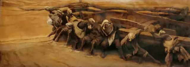 《黄河船夫》取了一个船舶在大风大浪中即将搁浅的角度,所有船夫不是在船上撑船,而是踏在泥泞中与汹涌的激流搏斗,拼命地将船舶拉向岸边。画面中透着一股奋勇抗争的力量,给人一种极为震撼的视觉效果。