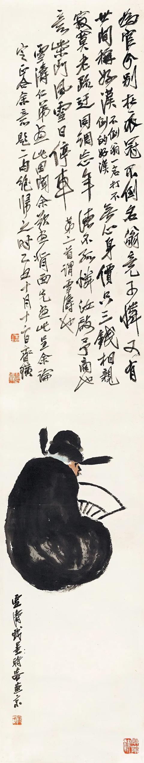 《不倒翁》是王雪涛拟齐白石意所作,齐白石为其在画面上方题字表示嘉许。不倒翁可比喻某些善于左右逢源,而能长期保持自己权位的人,也体现了王雪涛对旧社会赃官的嘲讽。画面是一个头戴官帽、手持折扇呈背坐姿态的不倒翁。背面人物十分难画,需富有很强的笔墨表现力,但他用笔简洁传神,几笔浓淡墨便勾勒出了不倒翁阿谀谦卑的笨拙体态。同时,他对细节的描绘既生动形象,又充满了寓意。不倒翁的形态缩头耷脑,畏畏缩缩的神态体现在眼神的简洁用笔中,完全是一个丑角的形象。左右两边形态不一的帽翅儿,更是诙谐有趣。同时,不倒翁衣服与扇子的颜色形成一黑一白的对比,十分切题。