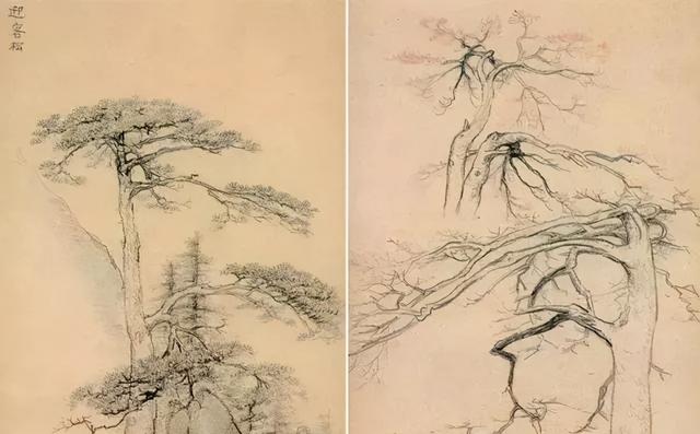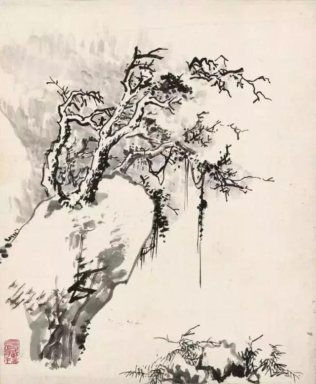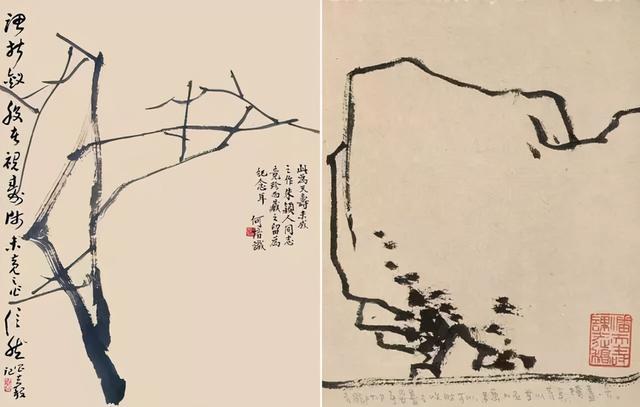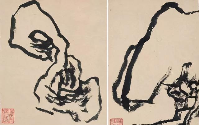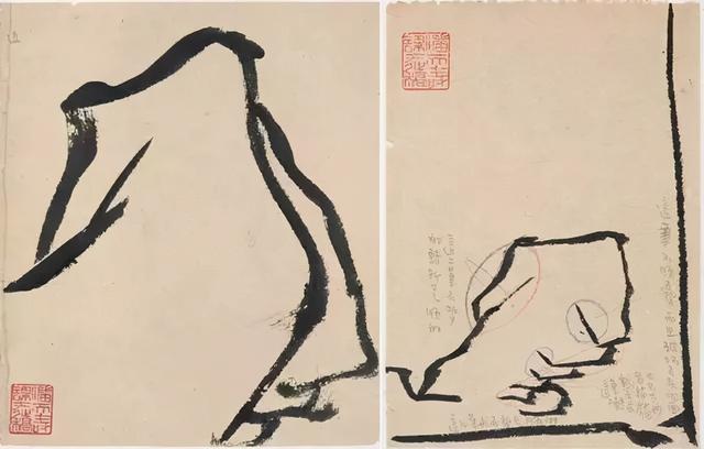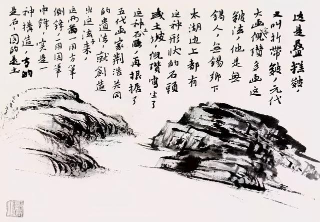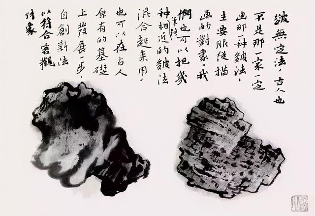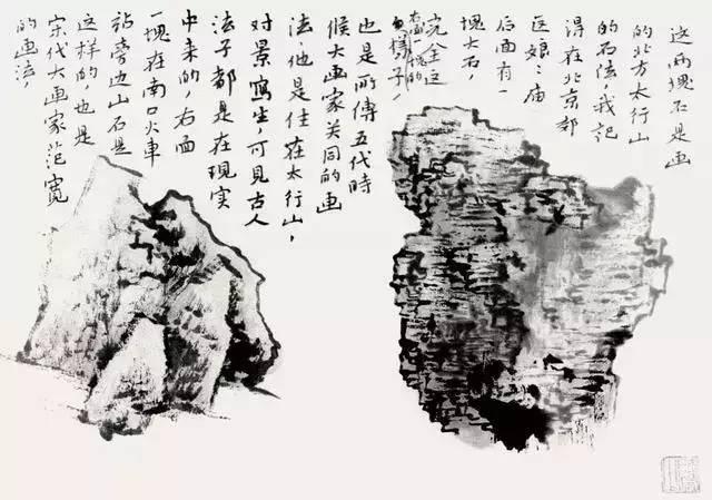 这两块石是画的北方太行山的石法,我记得在北京郊区娘娘庙后面有一块大石,完全这右面一块的样子,也是所传五代时候大画家关同的画法。他是住在太行山,对景写生,可见古人法子都是在现实中来的。右(左)面一块在南口火车站旁边山石是这样的,也是宋代大画家范宽的画法。