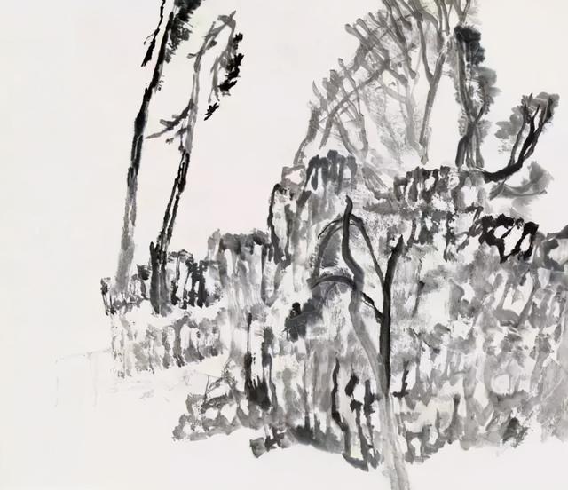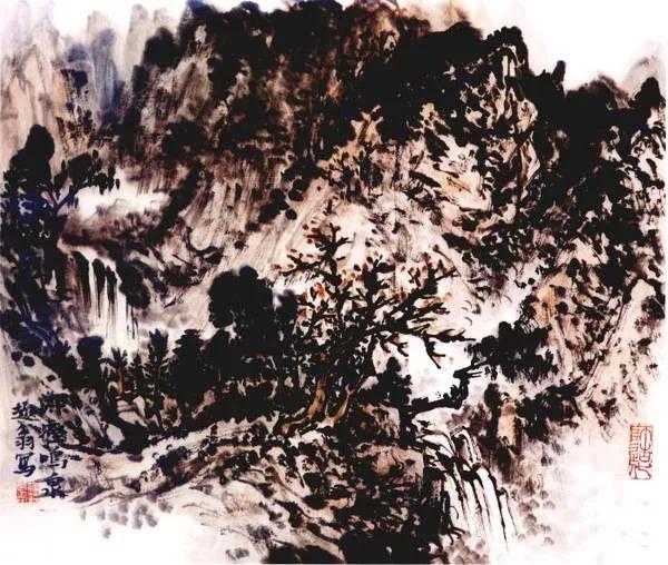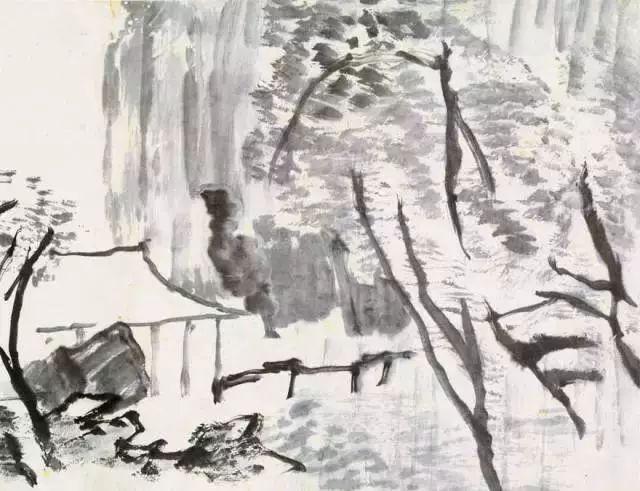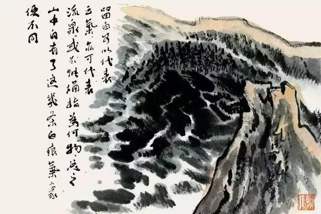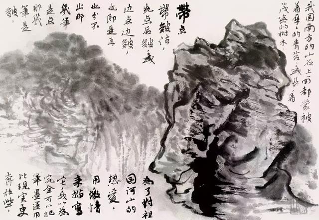 我国南方的山石上面都蒙披着厚厚的青苔,或长着茂密的树木。带点带皴法,先点后皴,或边点边皴,也即是再也分不出哪几笔是点,哪几笔是皴。为了对祖国河山的热爱,用激情来描写它,我以为完全可以把笔墨运用(得)比现实更奔放些。