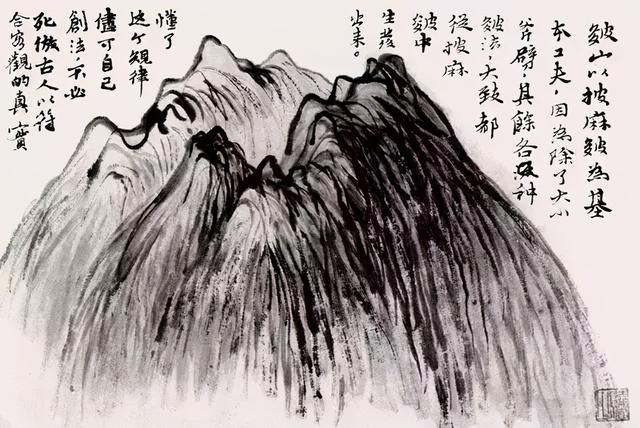 皴山以披麻皴为基本功夫,因为除了大小斧劈,其余各种皴法,大致都从披麻皴中生发出来。懂了这个规律,尽可自己创法,不必死仿古人,以符合客观的真实。