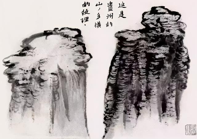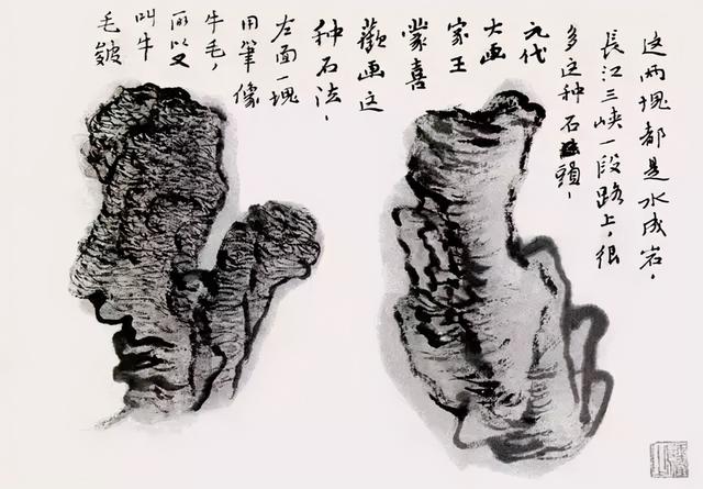 这两块都是水成岩,长江三峡一段路上,很多这种石头,元代大画家王蒙喜欢画这种石法。左面一块用笔像牛毛,所以又叫牛毛皴。