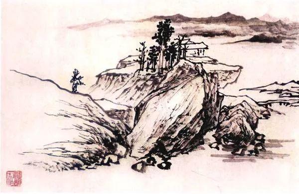 这是叠糕皴,又叫折带皴,元代大画家倪瓒多画这皴法。他是无锡人,无锡乡下太湖边上都有这种形状的石头或土坡。倪瓒写生了这种土石,再根据了五代画家荆浩、关同的遗法,就创造出这法子来。这两图一用方笔侧锋,一用圆笔中锋,实是一种构造,方的是石,圆的是土。