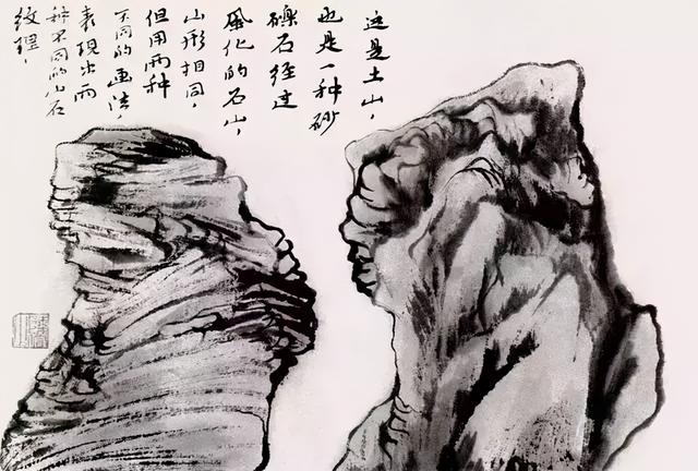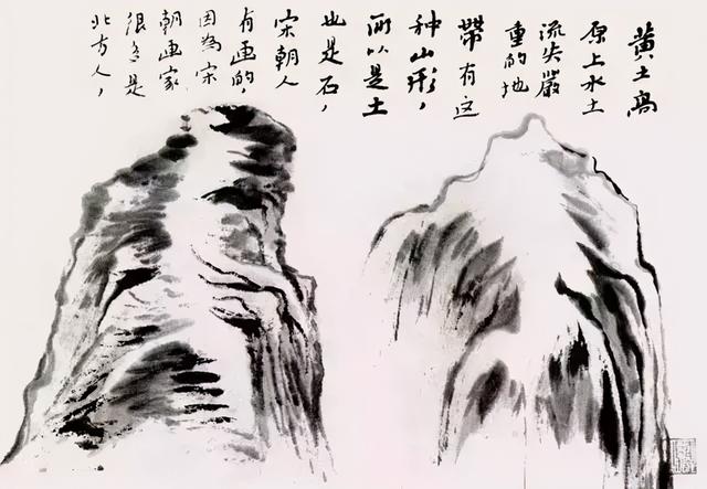 这是土山,也是一种砂砾石经过风化的石山,山形相同,但用两种不同的画法,表现出两种不同的山石纹理。