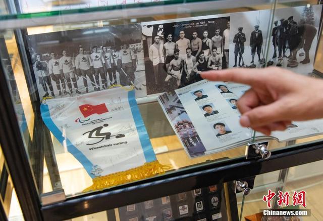 图为马烈收藏的、在平昌冬残奥会上为中国代表团夺得首枚冬残奥金牌的轮椅冰壶队的签名队旗(左前)。 中新社记者 侯宇 摄
