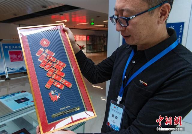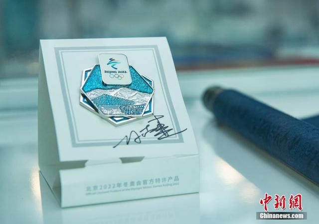 图为马烈送展的、附有设计者林存真签名的北京2022年冬奥会首款徽章。 中新社记者 侯宇 摄
