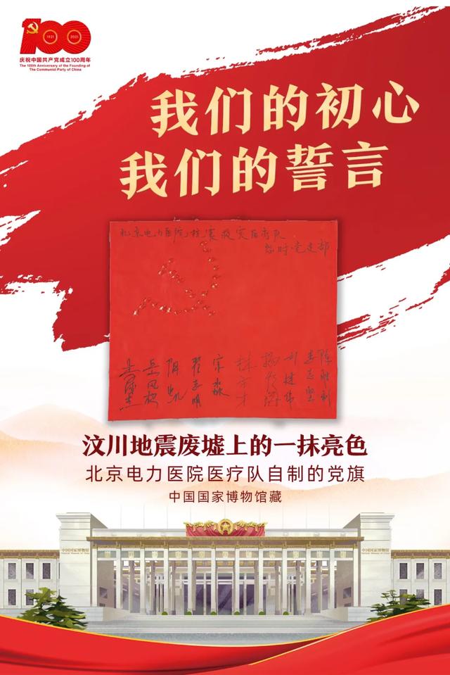 2008年汶川地震发生后,北京电力医院医疗队火速奔赴抗震救灾前线。5月21日晚,医疗队临时党支部委员会决定组织一次宣誓仪式。队员们打着手电筒和应急灯,从宣传标语条幅旁空白处剪下一截,裁剪成60厘米宽、70厘米长的条幅,用26枚小党徽别成党旗上的党徽形状,做成了这面特殊的党旗。