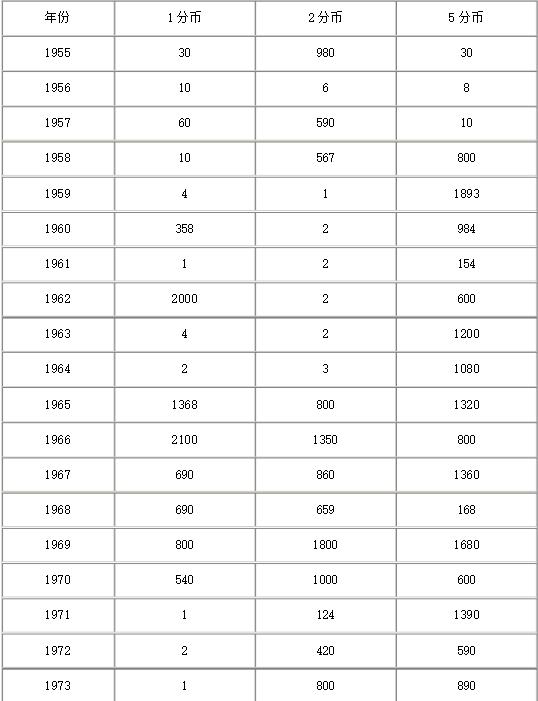 我国的第二套人民币首发于1955年,但是当时并没有发行硬币,硬币直到1957年才发行,这也是我国的首次面世的硬币,一共推出了3枚,面值分别是1分、2分和5分,其中首枚年份为1955年(虽然是1957年发行,但是日期是1955年第二套人民币推出的时间),材质为铝镁合金,该套硬币可谓流币中的常青树,60多年过去了,至今仍在流通,虽然说目前基本没有人有使用1分、2分、5分,但其仍然没有退出市场(一般如果退出流通,国家会发文,要求在居民在一定的期限内到银行兑换新币,否则后续不再回收)。
