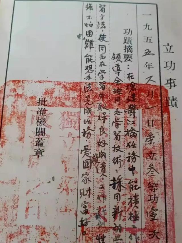 大学毕业那年,爷爷把他年轻时获得的军功章和立功事迹送给了我。1950年,爷爷参加抗美援朝战争,由于表现突出,1953年10月,爷爷获得抗美援朝纪念章。1955年,他在抢建江桥任务中,不怕困难,采用新的学习方法,努力完成任务,取得良好成绩。