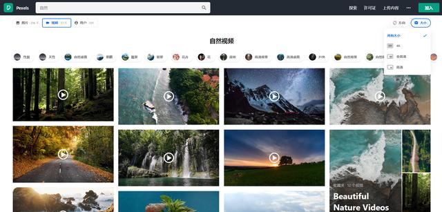 可以直接搜索或者用标签搜索视频的类型,并且在右上角可以筛选视频的品质大小,其中就包括4K级的视频。
