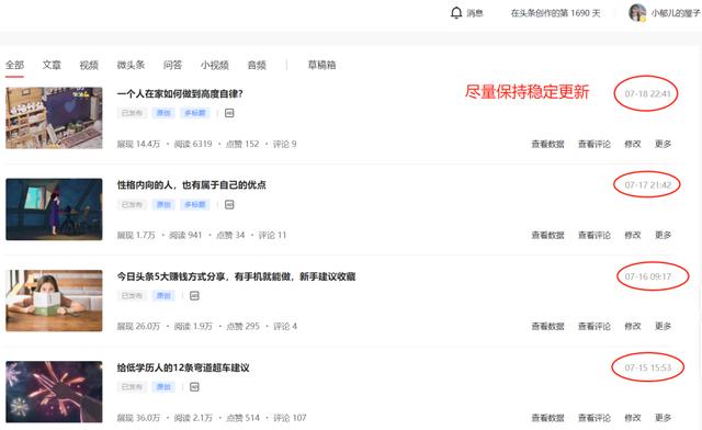21.不管今日头条还是其他平台,最怕的是断更,既然选择了自媒体,就要做好持续输出的准备,建议断更时间最长不要超过一周,当然能日更最好。