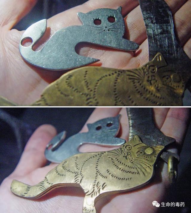 手工制作的小猫不锈钢起子和小铜刀,花纹都是手刻的,小别致