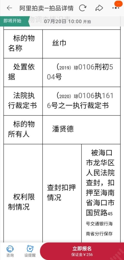 拍卖公告显示,这批丝巾主人名叫潘贤德,案号(2019)琼0106刑初504号。企查查APP显示,2012年10月,年仅25岁的他开始担任交通银行海南省分行个人金融部市场推广经理,负责特许商品(贵金属产品)销售业务的管理。