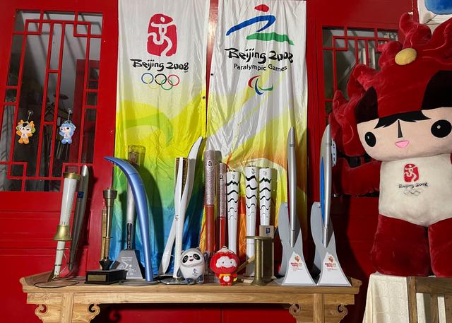 走进张文全的家,不到20平方米的前厅竟然有千余件奥运藏品。靠北的长条桌上摆放了十余支奥运火炬。其中,两支北京奥运会的祥云火炬摆在中间,旁边是里约奥运会、索契冬奥会、平昌冬奥会,以及1980年莫斯科奥运会的火炬。火炬后面的墙上悬挂着两面北京奥运会的景观旗。